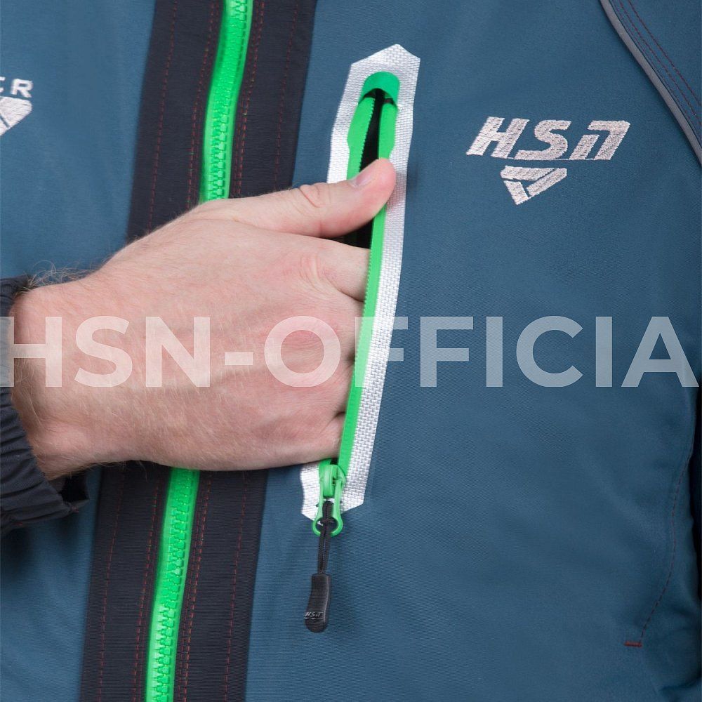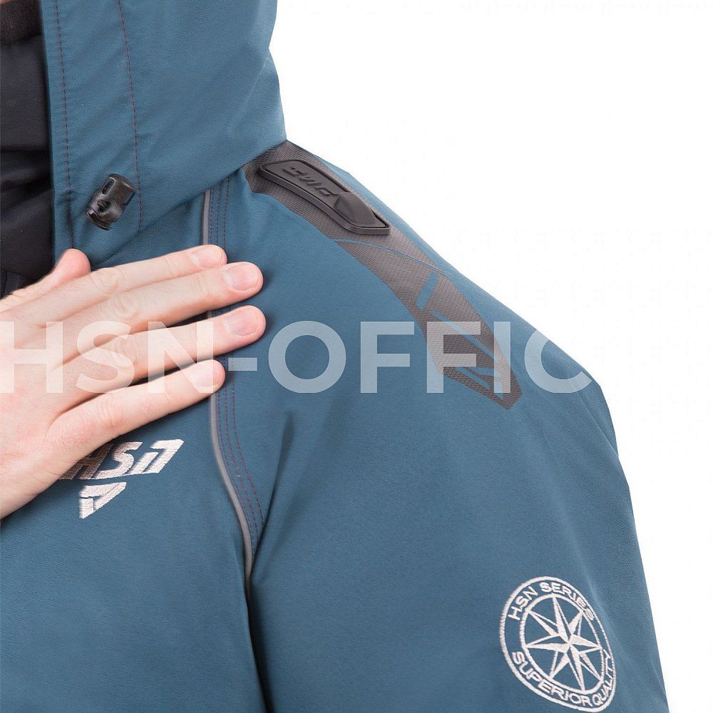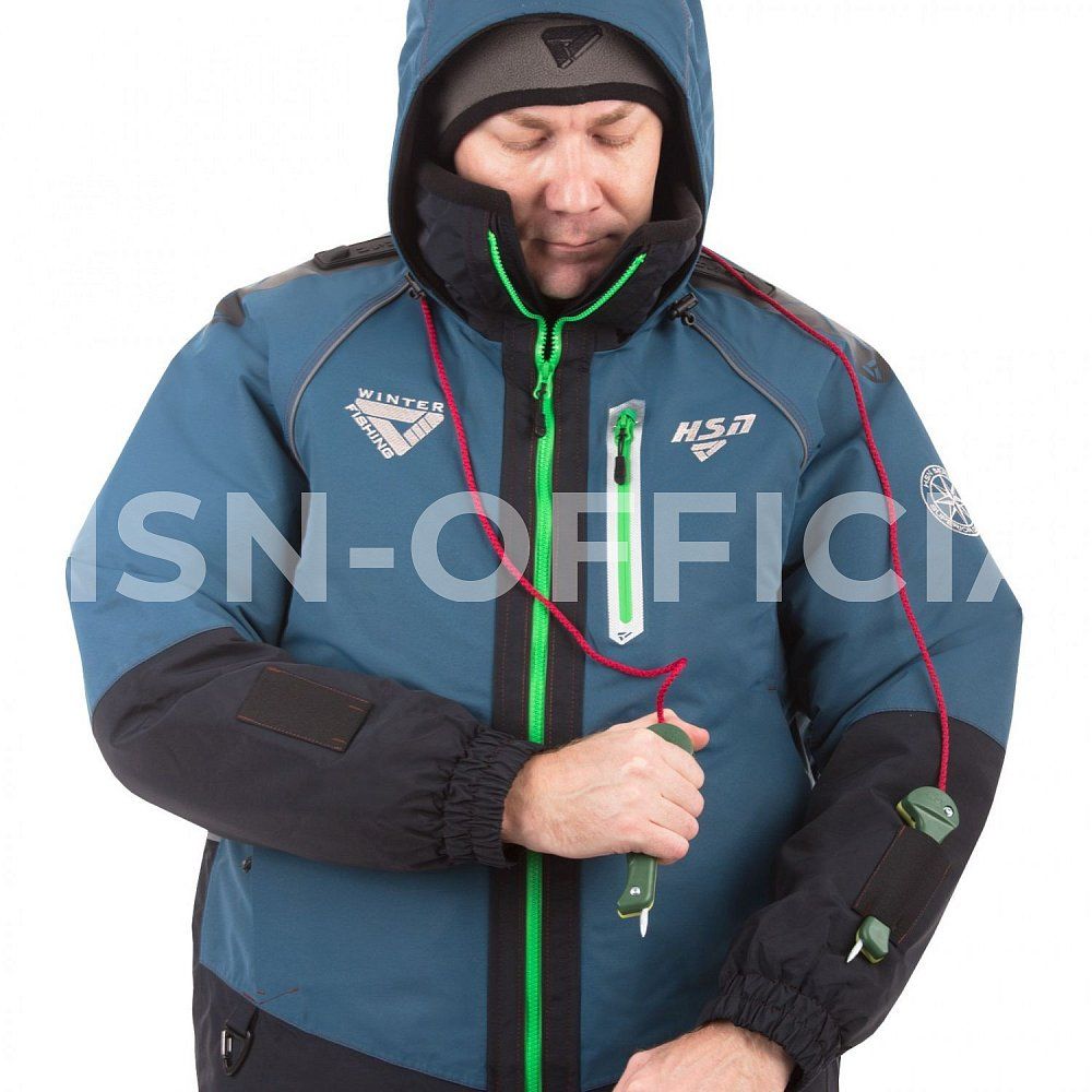 Куртка оснащена высоким воротником для защиты от ветра и глубоким капюшоном с жестким ветрозащитным козырьком. Утепленные карманы на куртке предназначены для размещения необходимого снаряжения и согрева рук. Специальные крепления для спасалок (идут в комплекте) и перфорация ткани на спинке и рукавах облегчают выход из воды при случайном падении.