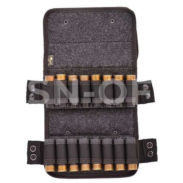 Изготовлена в традиционной форме из специальной ткани. Надежно держит 16 патронов в лузах.