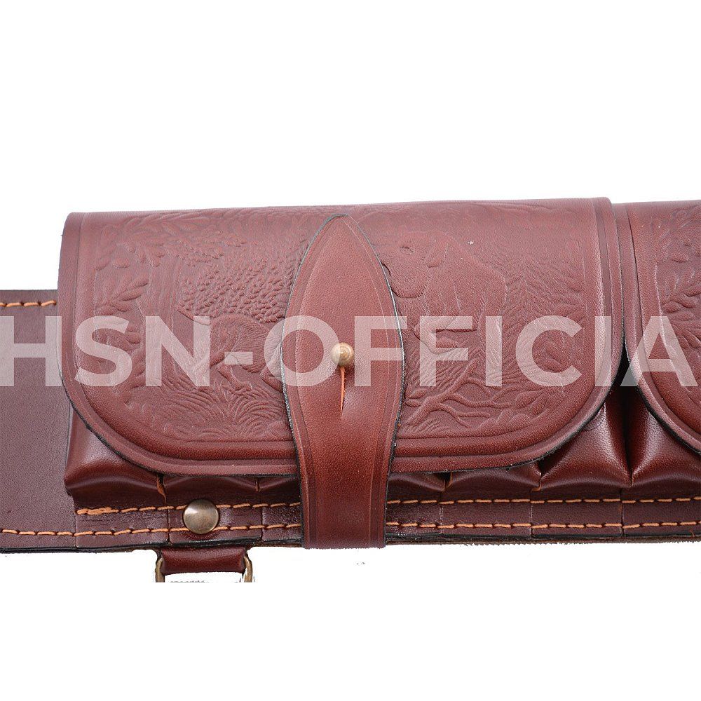 Изготовлен в традиционной форме из натуральной кожи. Патронташ надежно держит 24 патронов в лузах. Позволяет загрузить патроны снаряженные в гильзы длиной от 70мм. до 89мм. Оснащен клапанами для защиты патронов от не погоды.