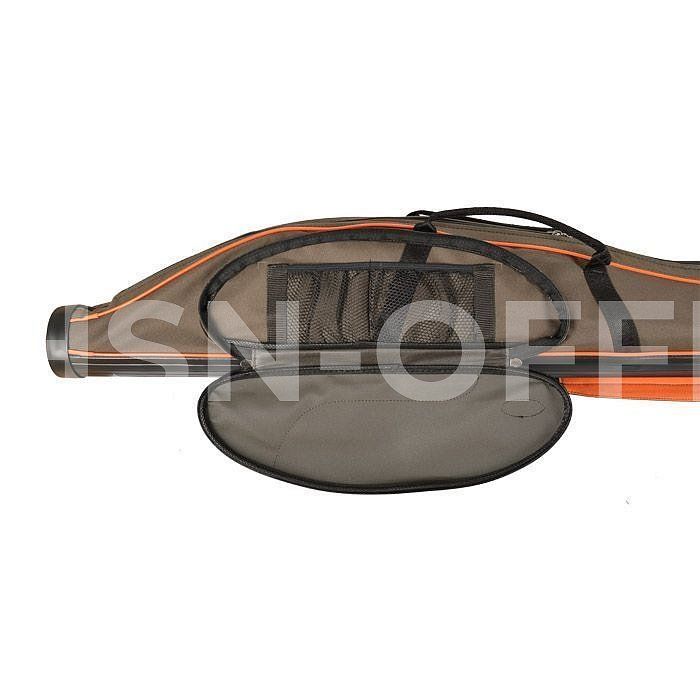 С наружной части чехла используется износостойкая и водоустойчивая ткань, которая легко очищается от грязи. Внутри и по бокам обклеена ППУ 2 мм. Стенки сбоку и перегородка покрыты тканью наполнителем ППЭ для защиты от трения и внешних повреждений. В производстве применяют итальянскую фурнитуру, почти не звенящую и не бликующую, а раскрой изделия выполняется на специальном для этого оборудовании, что обеспечивает отличное качество. Для более удобного переноса в конструкции тубуса предусмотрен ремень на плечо и ручка. Есть карманы, а также карманы-секции для использования стойки или подставки. В тубусе помещается от двух до пяти спиннингов. мягкие чехлы для катушек( 2 шт.) идут в комплекте.